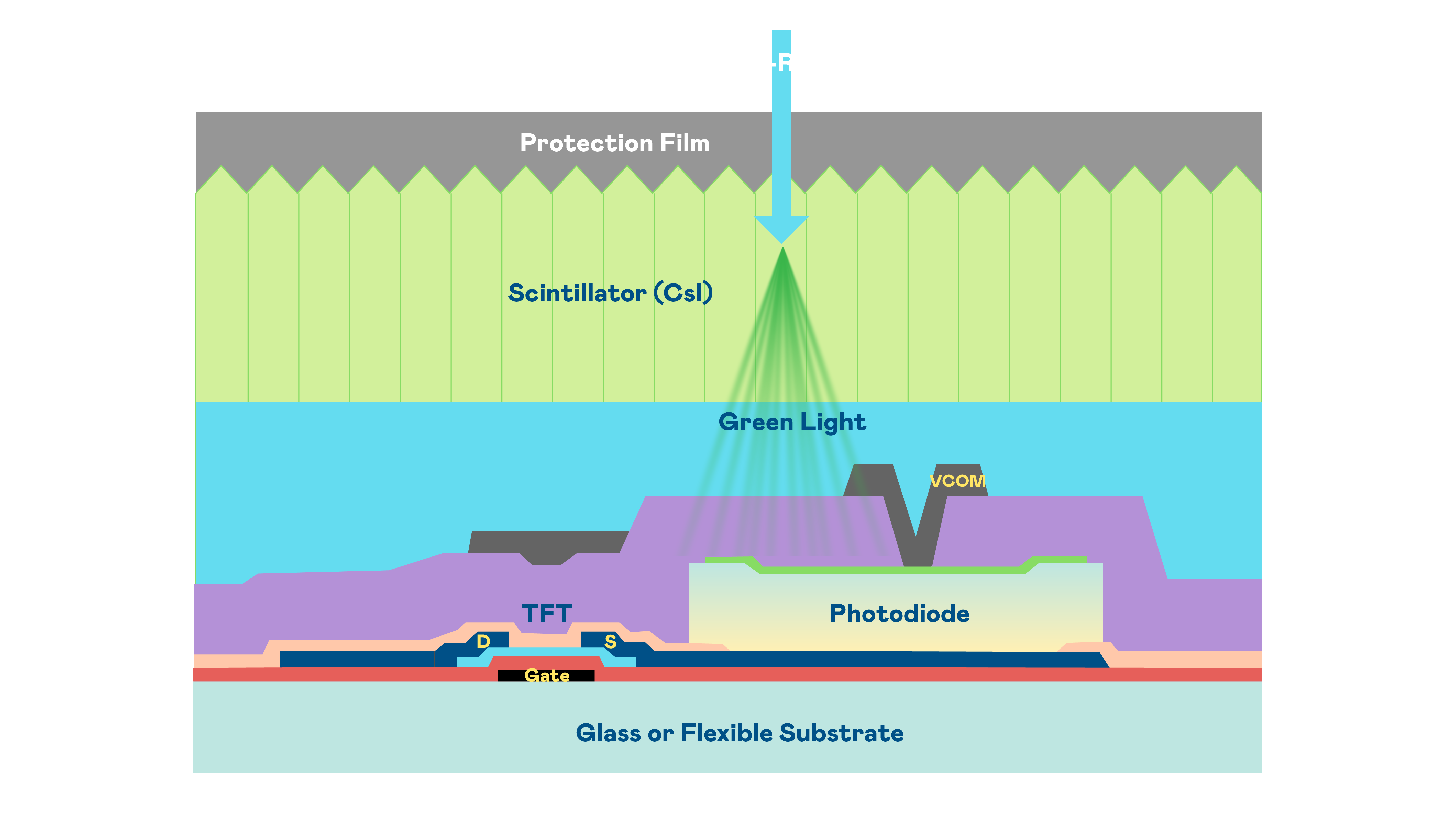 AG百家乐的X光影像感测阵列使用薄膜电晶体 (TFT) 作为每个像素的读取开关,搭配光电二极体(Photodiode)的光电转换元件,用以感测X光影像讯号。